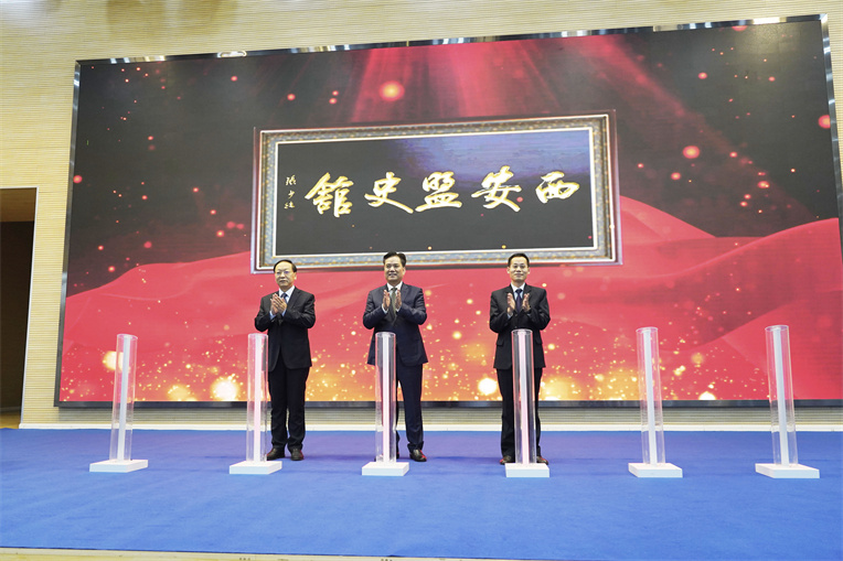 张道宏、虞浩桂、范九伦为“西安盟史馆”揭牌。