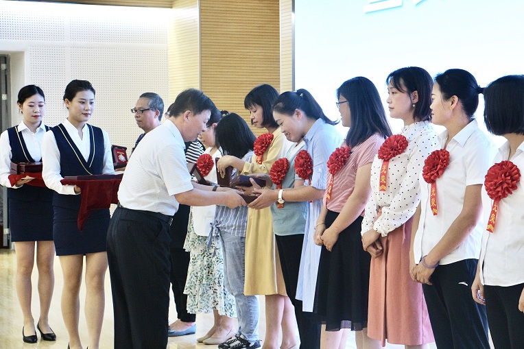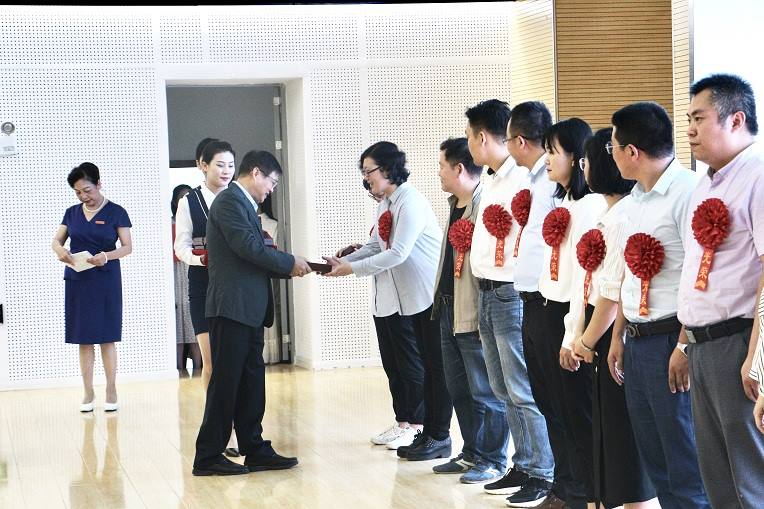 校长李瑞明,校党委书记,副校长张陵、陈登文、雷鸣为在校工作10年以上教职工颁发“光荣在校十年以上教师”荣誉奖章。