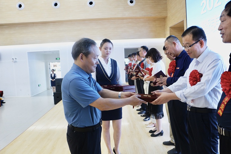 校党委孙冰红为校长李瑞明颁发“特殊贡献荣誉勋章”。