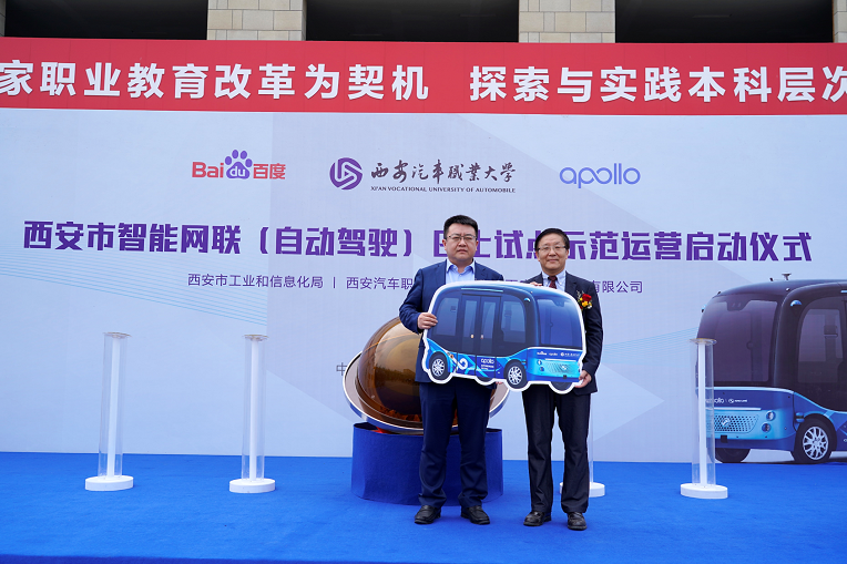 此次在我校落地启动的西安市智能网联(自动驾驶)巴士示范运营项目,由百度公司提供阿波龙无人驾驶车、通讯基站和辅助器材。启动仪式上,百度智能交通总经理冯晓雪将象征智能网联(无人驾驶)巴士的车辆模型交付给张陵副校长。
