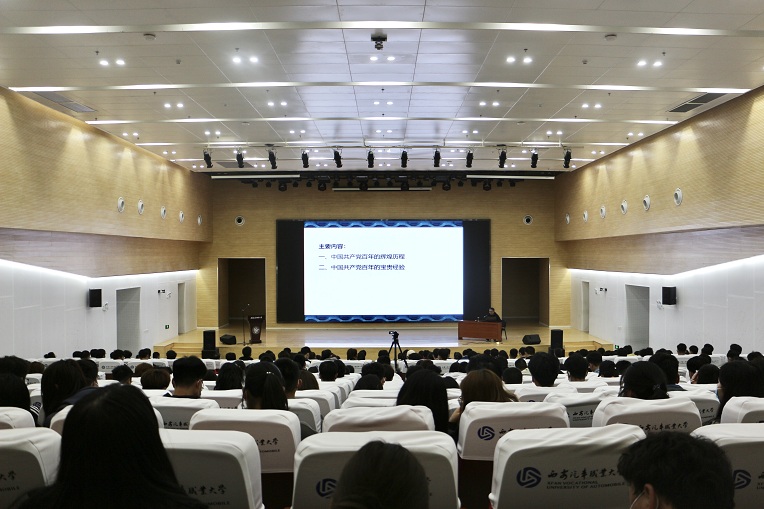 2021年4月1日下午,我校特邀西安财经大学闫团结教授在临潼校区渭水报告厅做题为“中国共产党百年辉煌历程和宝贵经验”的讲座,党委书记孙冰红、全体党政领导、思想政治课教师、入党积极分子参会,会议由校党委副书记、副校长吴毅主持。