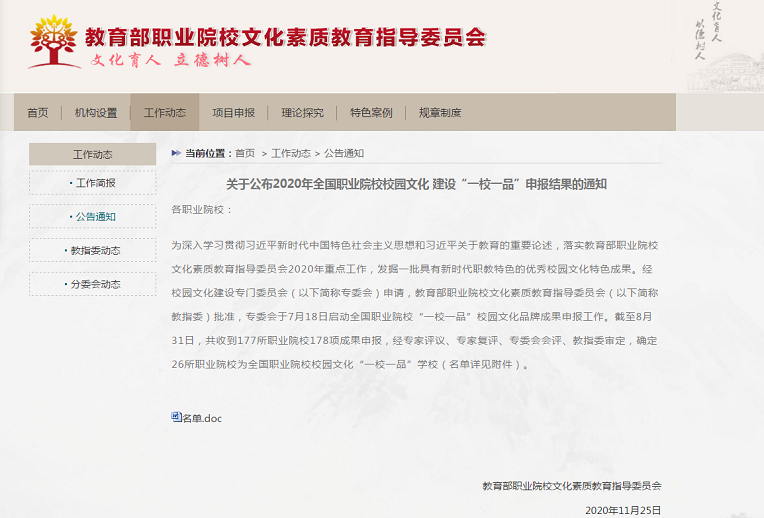 全国职业院校“一校一品”校园文化建设品牌申报活动由教育部文化素质教育指导委员会校园文化建设专门委员会发起,经专家评议,教育部文化素质教育指导委员会审定,并落实教育部职业院校文化素质教育指导委员会重点工作,发掘一批具有新时代职教特色的优秀校园文化特色成果。