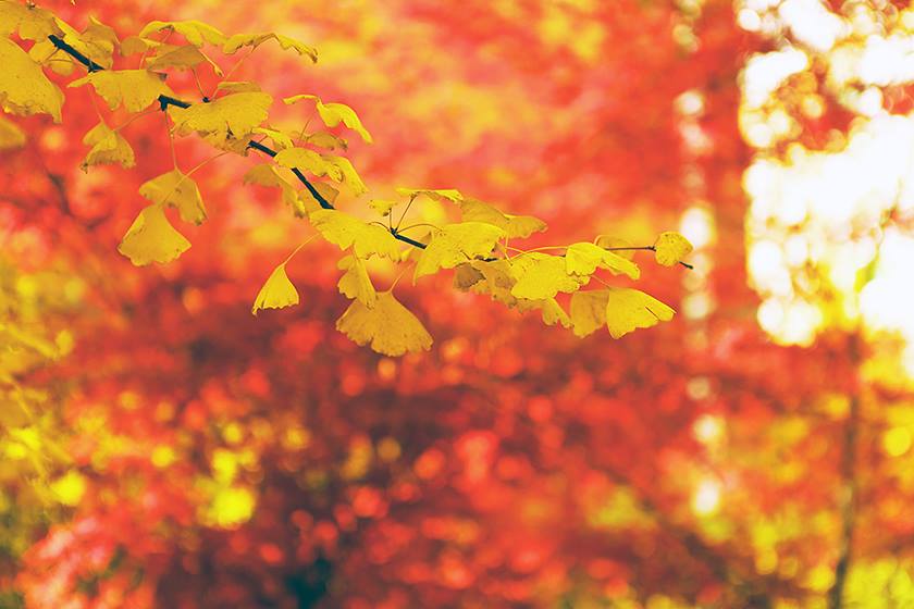 和煦的阳光透过赤橙、黄澄的残叶,
