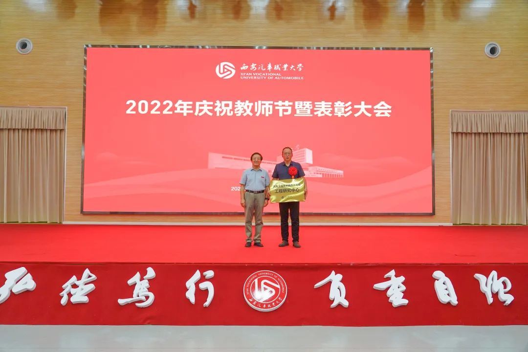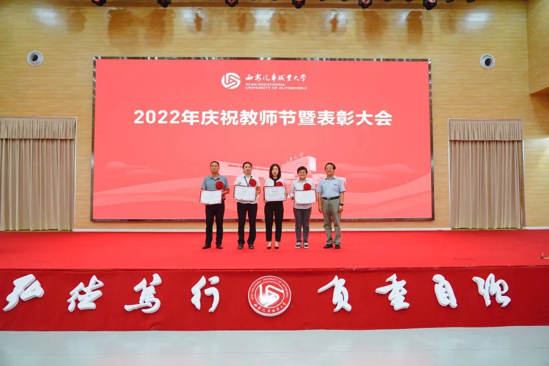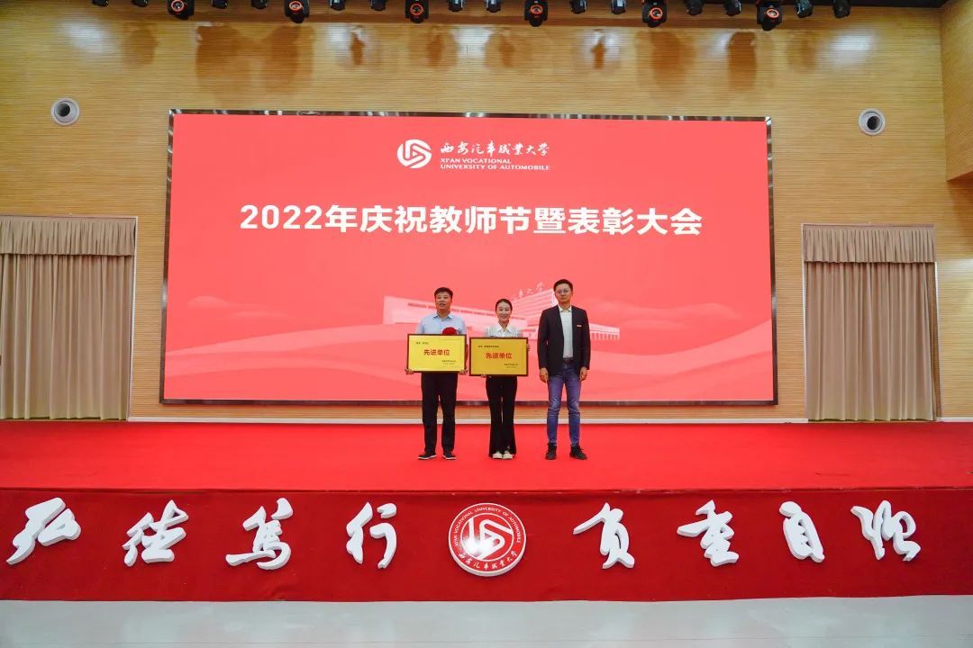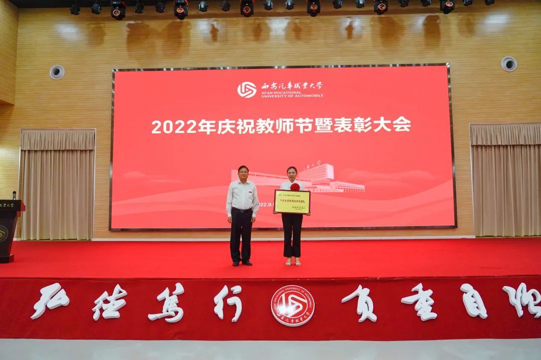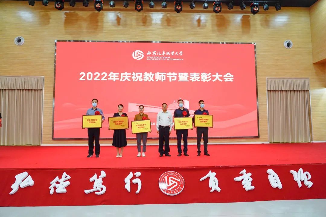 校党委书记孙冰红为汽车工程学院授牌“陕西省师德师范团队”,为获得2021年度师德师风建设先进集体代表和先进个人颁奖;