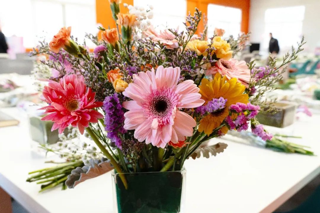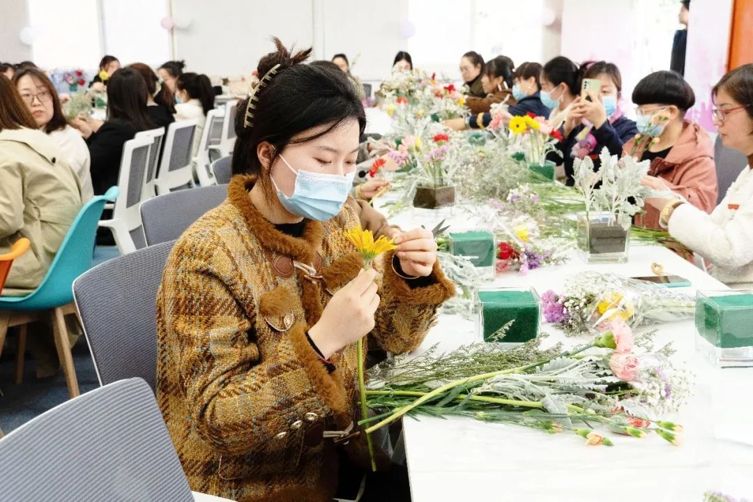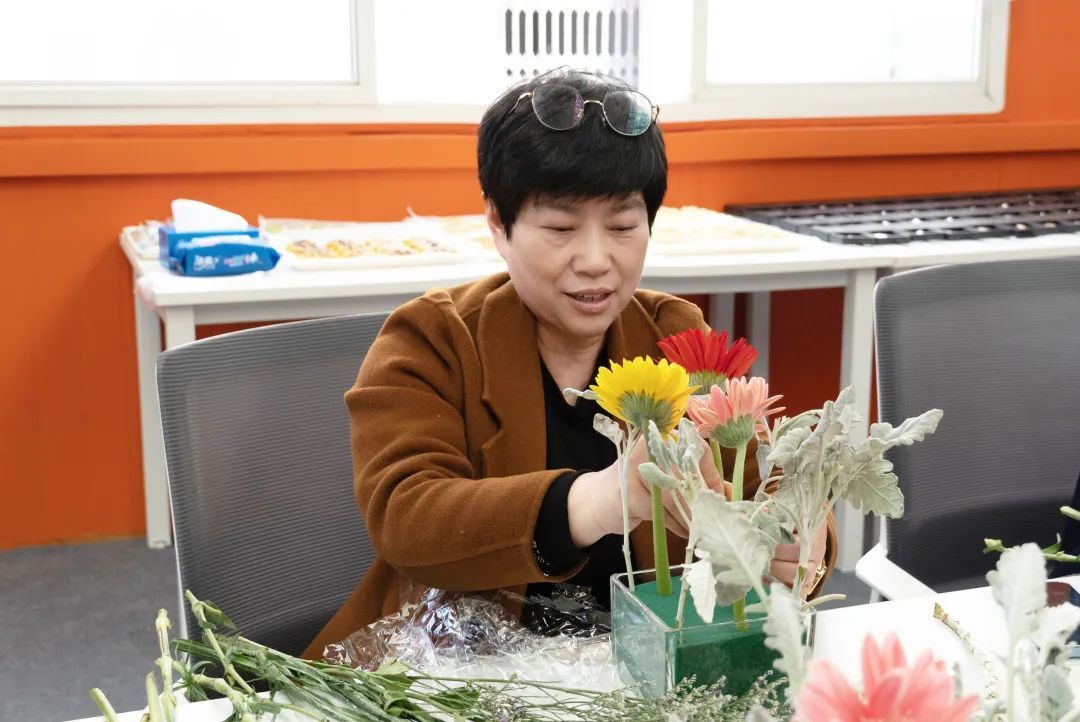 随后,大家加入到现场的插花活动中,经过一系列的挑选、修剪、搭配,零散的花朵在她们手里变成了一件件花艺作品,活动现场花香四溢,热闹非凡。
