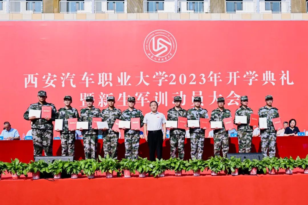 校长李瑞明为荣获“车匠人”优质生源的2023级新生颁奖并合影留念。