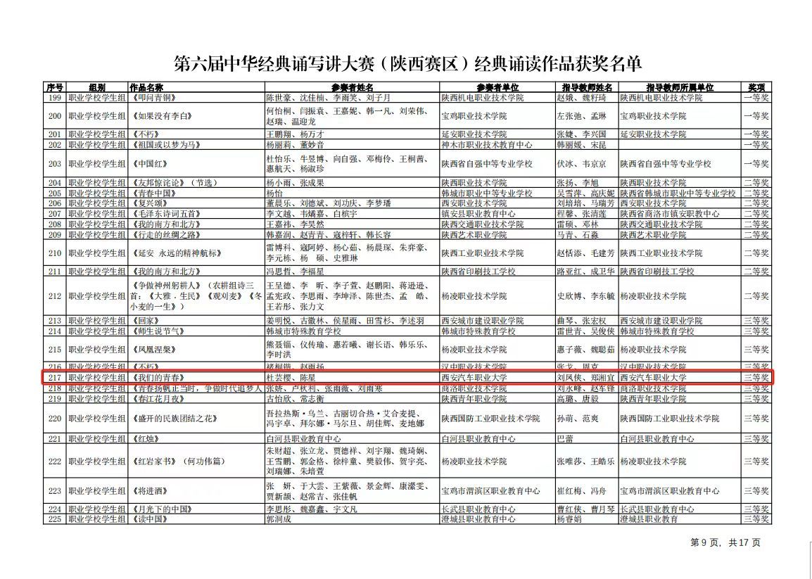 9月11日,第六届中华经典诵写讲大赛(陕西赛区)评选结果揭晓,我校刘风侠、郑湘宜指导的设计与艺术学院杜芸樱、文理学院陈星的朗诵作品《我们的青春》荣获大学生组三等奖。