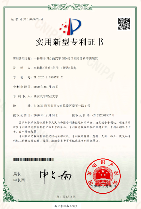 2020年12月1日,我校新能源学院李鹏伟老师“一种基于PLC的汽车OBD接口故障诊断培训装置”喜获国家实用新型专利授权,专利号:ZL202020969791X。
