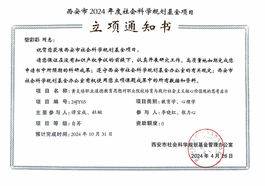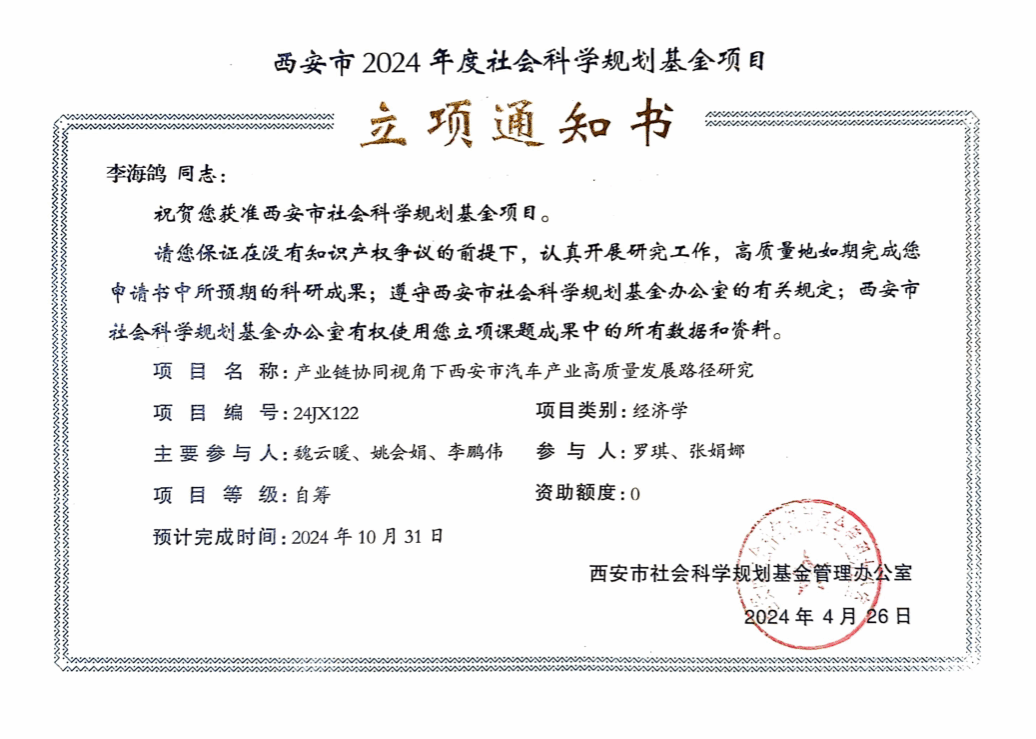日前,西安市社会科学规划基金管理办公室发布了《关于2024年西安市社会科学规划基金立项项目的公示》,我校李海鸽、柴彩彩两位老师带领团队申报的科研课题获批。