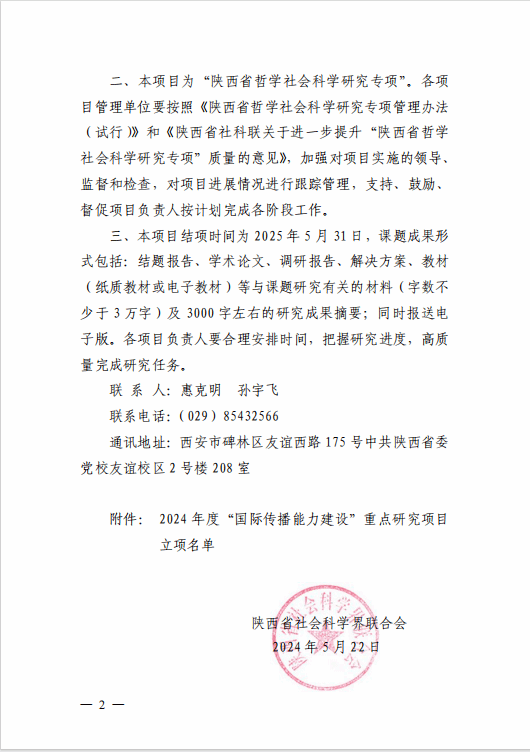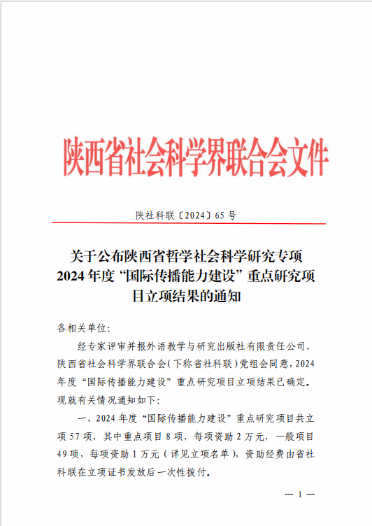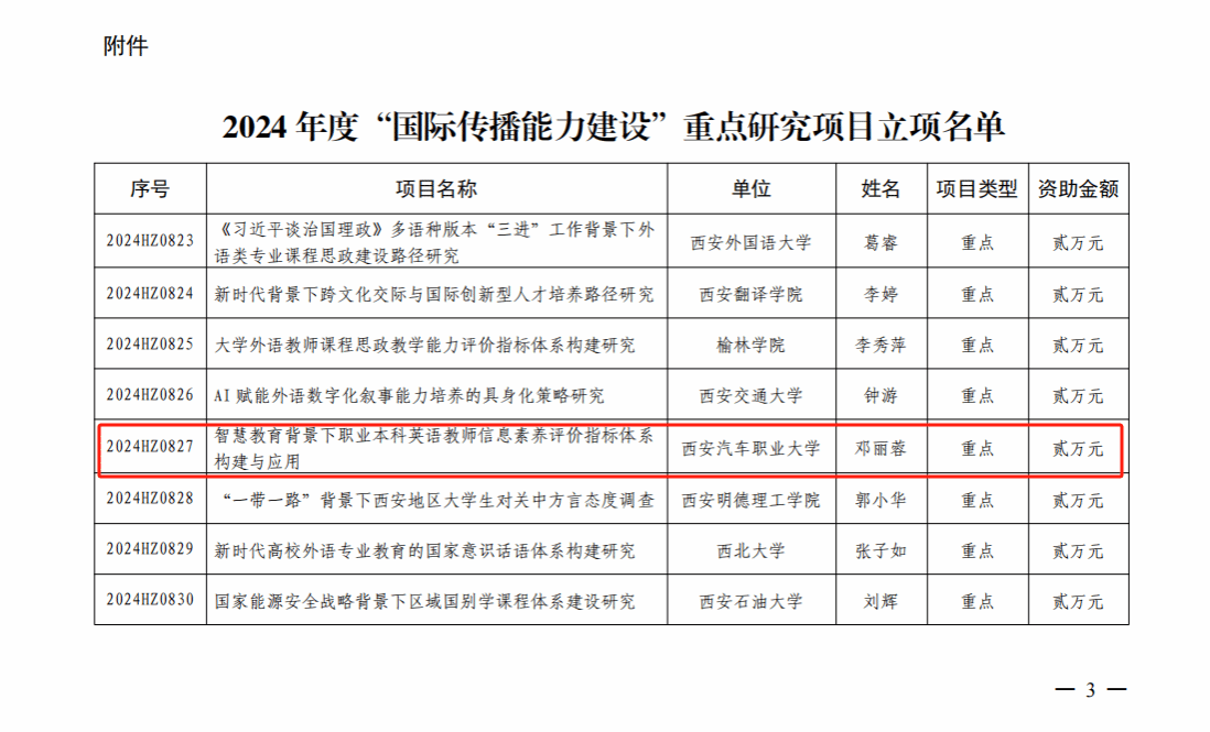 2024年5月,陕西省社会科学界联合会公布了2024年度国际传播能力建设重点研究项目立项名单,我校邓丽蓉副教授团队申报的《智慧教育背景下职业本科英语教师信息素养评价指标体系构建与应用》获批立项重点课题。