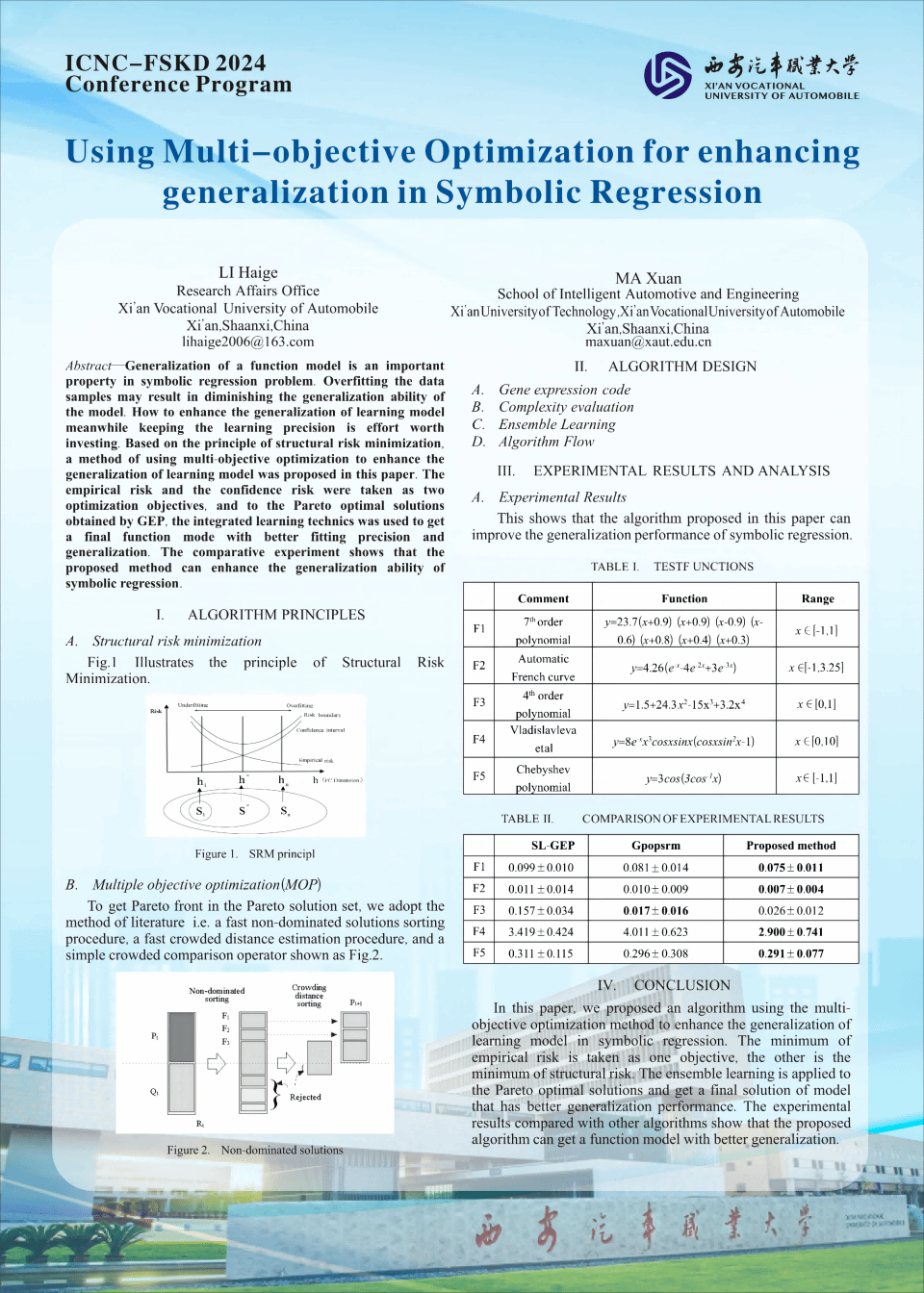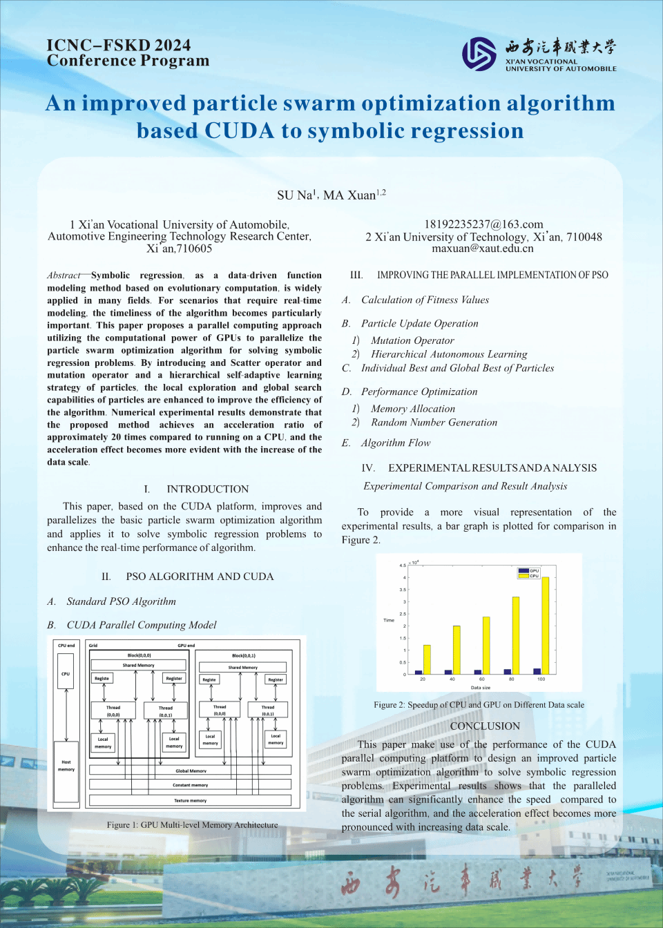 我校李海鸽和苏娜老师在会议上以海报形式展示了他们的研究成果,获得了广泛关注。在智能网联汽车工程技术专业带头人马炫教授的悉心指导下,他们从2023年开始开展研究,并取得了阶段性成果。李海鸽的论文《Using Multi-objective Optimization for Enhancing Generalization in Symbolic Regression》通过多目标优化技术显著提升了符号回归算法的泛化能力。苏娜的论文《An Improved Particle Swarm Optimization Algorithm Based on CUDA to Symbolic Regression》则利用CUDA技术改进了粒子群优化算法的计算效率。