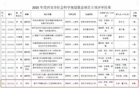 近日,据西安社科网西安市社会科学院 西安市社会科学界联合会官网“社科管理”栏目公布信息,我校王玲老师主持申报的2025年西安市社会科学规划基金项目“基于产教融合的人才培养模式研究”(项目编号:25JY119)获批立项。