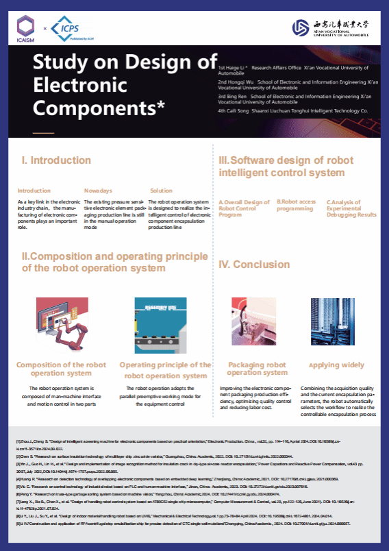 在国家银龄教师吴宏岐教授的指导下,我校任冰老师团队的研究论文《Study on Design of Electronic Components Packaging Robot Control System》以海报形式亮相会议现场。该研究围绕压敏电子元件包封生产线的智能化改造,通过构建工业机器人智能包封生产线、优化设备布局、设计模块化柔性控制流程、创新安全归零与防碰撞机制,实现了生产线的全流程智能控制、自适应生产及安全运行,为电子制造行业的自动化升级提供了关键技术支撑。