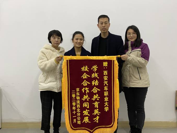 2020年11月24日下午,京东物流西北分公司校企合作总经理白光泽专程来到我校为经济管理学院送上了一副锦旗:“学践结合共育英才,校企合作共同发展”,对我院和京东物流西北分公司校企合作以来的优秀表现给予了高度肯定与赞扬。