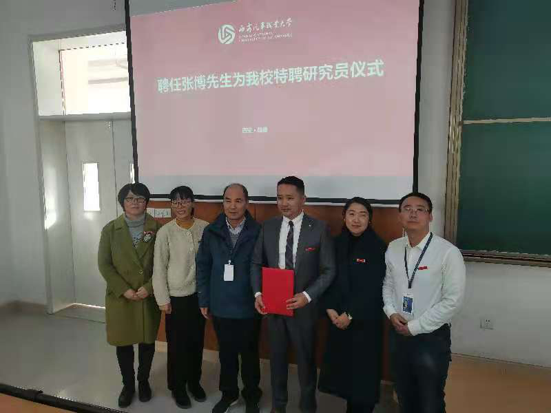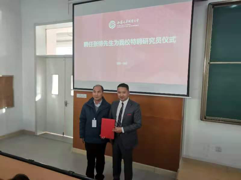 图片(校长助理穆乾坤为特聘研究员张博颁发聘书)