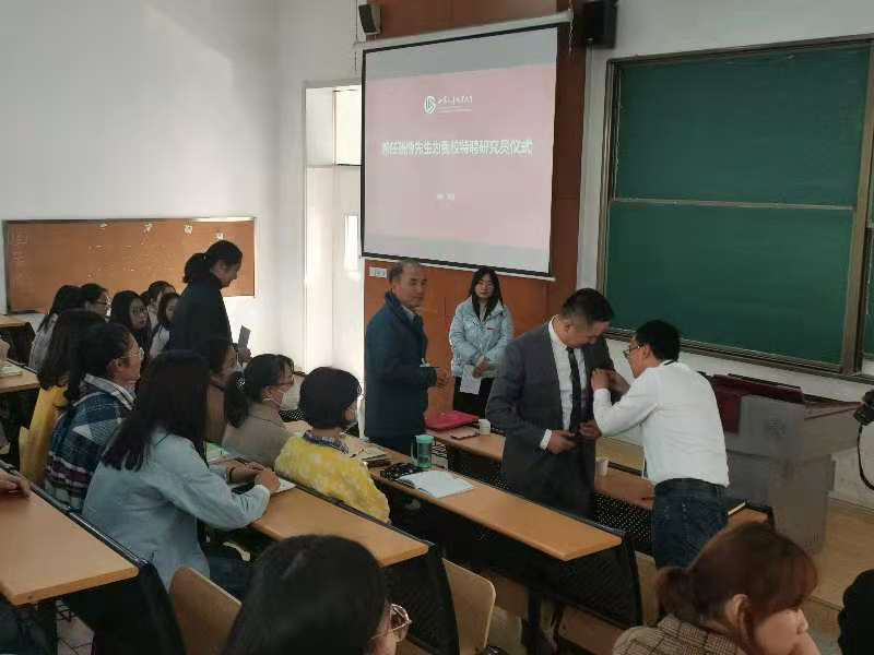 图片(教务处长左浩为特聘研究员张博佩戴校徽)