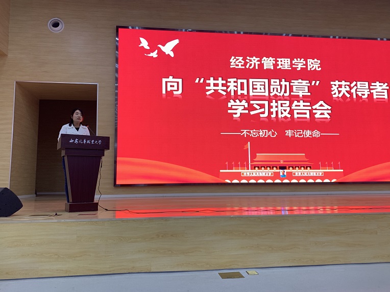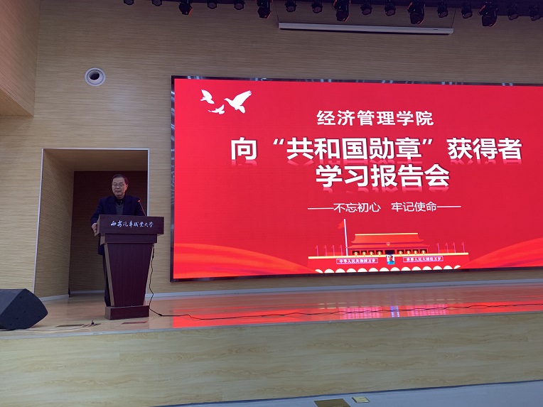 10月12日下午,我校经济管理学院成功举办向“共和国勋章获得者学习”报告会活动,本次报告会是落实我校“不忘初心、牢记使命”主题教育的重要组成部分。报告会由经济管理学院学生党支部书记王荣刚同志主持,李茜副院长、全体辅导员和在校学生参加,学院党总支书记、院长康凯教授出席并讲话。